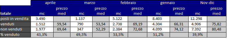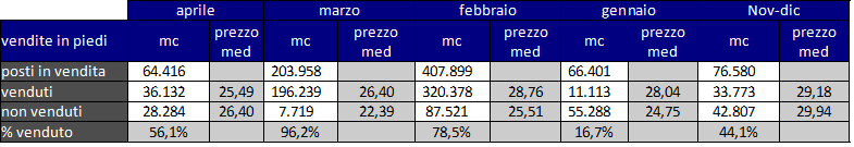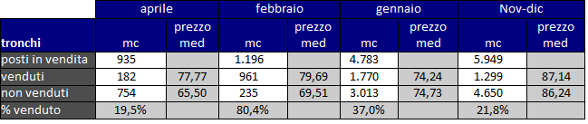 Dopo i grandi quantitativi venduti in febbraio e marzo (oltre 500.000 mc) ad aprile c’è stato un rallentamento: sono stati posti in vendita 65.000 mc, di cui ne sono stati venduti il 56%: il prezzo medio è sostanzialmente stabile (-0,9 €/mc rispetto a marzo).