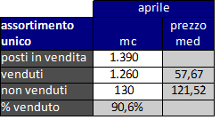Si riporta il dato delle vendite in assortimento unico, che ha costituito l’83% del totale delle vendite: il prezzo medio è in linea (leggermente inferiore: -1,87 €/mc) con il valore medio delle vendite complessive.