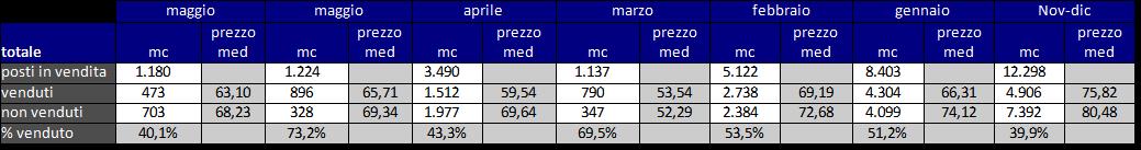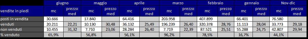 Quantità in (leggera) ripresa delle vendite tramite il sito (www.legnotrentino.it), con quota di vendita a 2/3, che restano però lontane dagli altri mesi. Nel legname non venduto ci sono 2.660 mc in assortimento presunto, che alza il valore medio: per le sole vendite in piedi il prezzo medio è di € 22,2, uguale a quello del venduto.